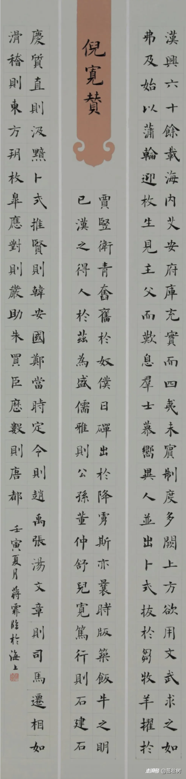 蔣霏同學臨摹唐朝的《倪寬贊》,第一映入眼簾的是整幅作品楷書要求寫得比較規范,基本上都在方格里。她的字在方格里面的大小、行與行之間的關系都比較和諧,給人以順暢之感?!赌邔捹潯返木€條變化比較強烈,細的地方寫得很細,捺腳則比較粗,有時起筆和收筆也比較重。橫筆畫的中間是比較細的,但要細得有彈性,不能細而無力。這幅作品,包括用紙和中間的嵌條,整體上比較舒服。