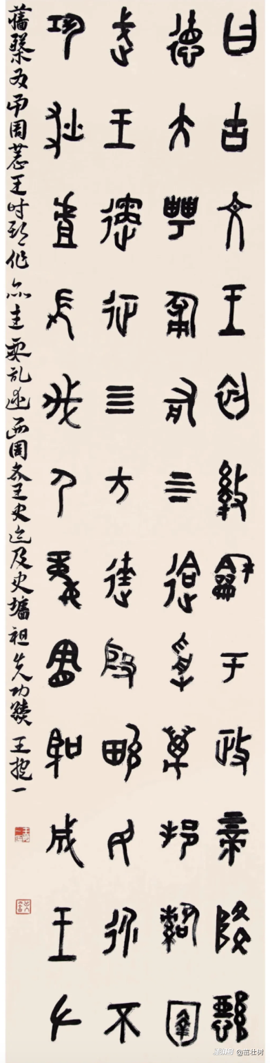 王抱一同學寫的是大篆,大篆里有好多字在現代漢語中找不到,所以我們在寫大篆時,如果遇到,如何把它編出來是個難題,弄不好就成了別字、錯字。所以寫大篆作品,第一就是字一定反復考究寫正確,只要搞錯一個字,整個作品都沒用了。