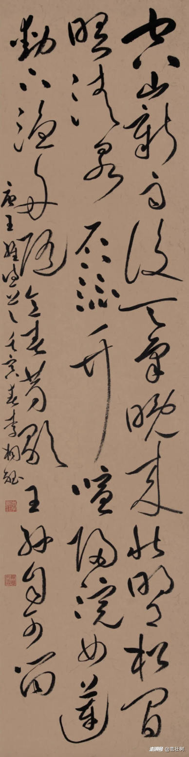 李桐鈺同學這幅是大草書,大草書有一個空間和時間的關系,加上有一定速度,所以書寫過程中,應該說是比較流暢,可見作者在草書上下了不少功夫,出來的線條基本符合審美要求,有一定彈性。要指出的是,作品的上半部分比較松,下半部分比較緊。建議以后再創作時,可以考慮調整一下,呈現更好的效果。