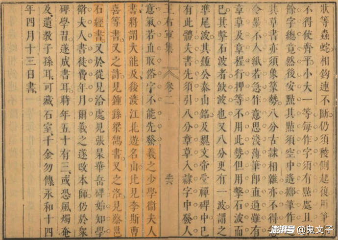 在王羲之《王右軍集》中的《題衛(wèi)夫人〈筆陣圖〉后》一文,他自述“予少學(xué)衛(wèi)夫人書,將謂大能,及渡江北游名山,見(jiàn)李斯、曹喜等書。”