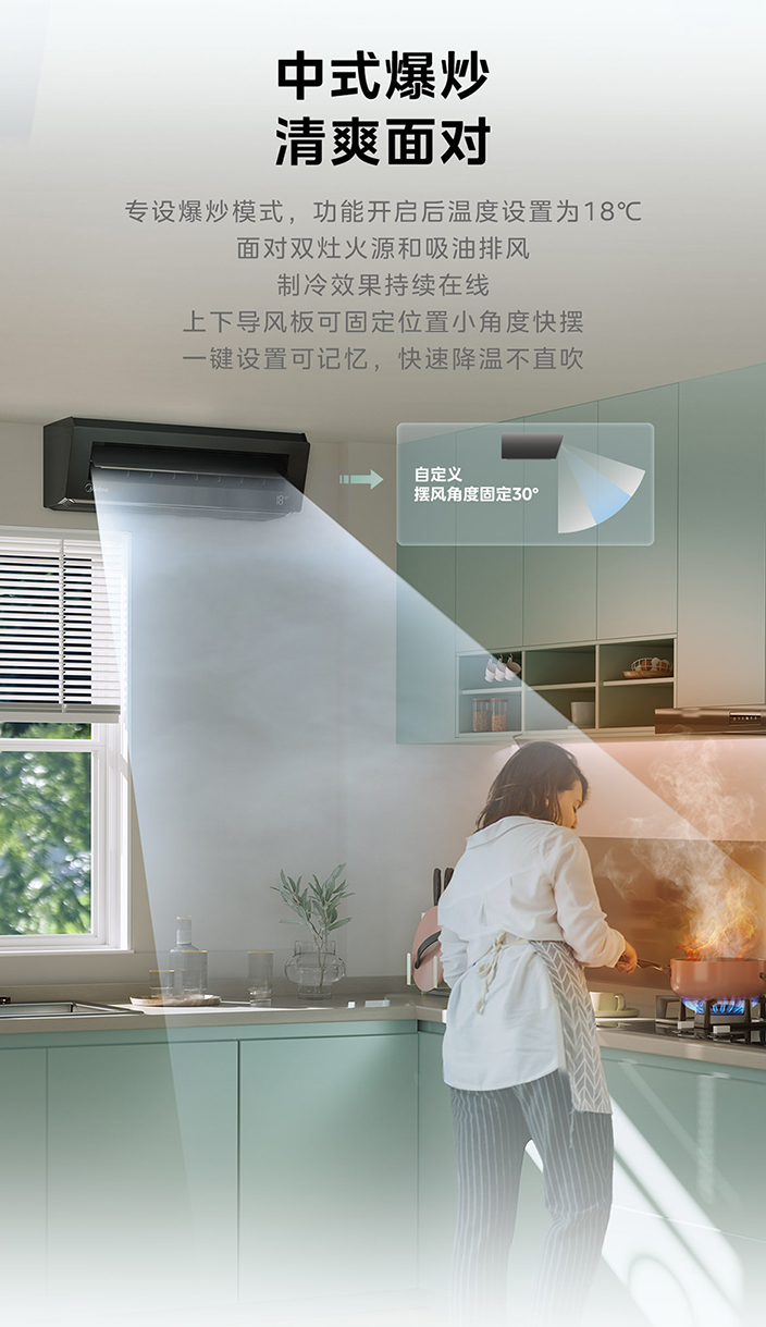 廚房太熱,向來不是一個新問題,解決方案也不是沒有。風扇/涼霸、開窗通風,這些都是很多人都嘗試過的辦法,甚至還有人直接安裝普通空調。但歸根到底,它們要么只能「湊合用」,要么并不能真正解決廚房高溫這件事。