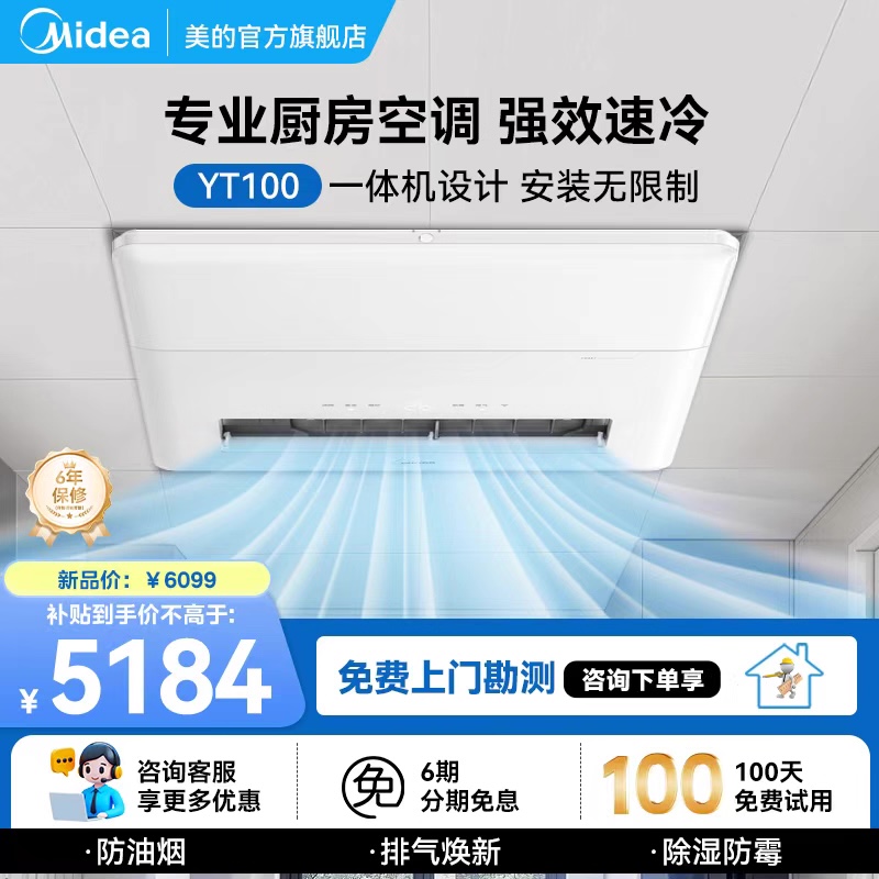 今年 3 月,美的還發布了最新一代的廚房空調 YT100,目前電商平臺國補可以 5000 元出頭到手,最大特點是無外機嵌入式設計,在無陽臺/無室外機位的廚房環境中也能安裝使用。此外,其壓縮機本體縮小 37%,重量減輕 19%,整體系統更輕便,安裝成本和復雜度也隨之降低,極大降低了對戶型的限制。