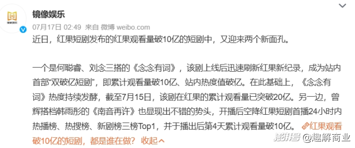 “趣解商業(yè)”注意到,行業(yè)“內(nèi)卷”讓很多短劇的內(nèi)核和表達(dá)都上了一個(gè)臺階。例如最近紅果短劇上線的大爆款《念念有詞》,就徹底拋棄了“扇巴掌”等狗血橋段,靠著有梗的臺詞、伏筆和療愈的愛情線吸引了大量觀眾。