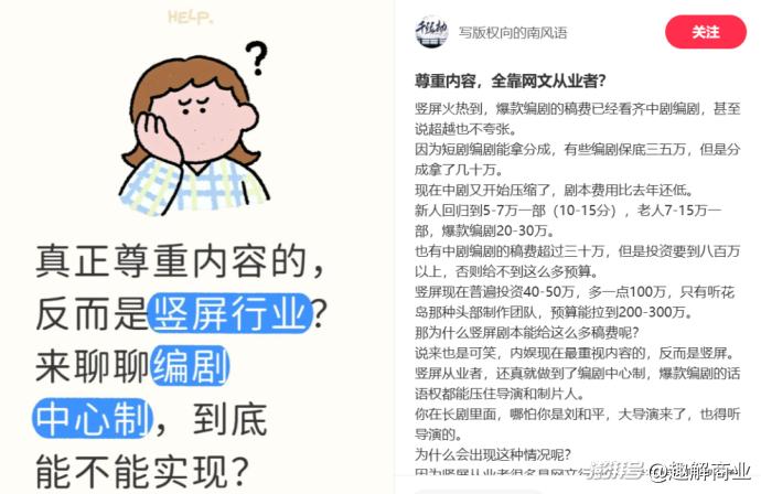 已經(jīng)售出多部影視版權(quán)的作者、編劇南風(fēng)語公開表示,爆款編劇的稿費(fèi)已經(jīng)看齊中劇編劇,甚至說超越也不夸張。