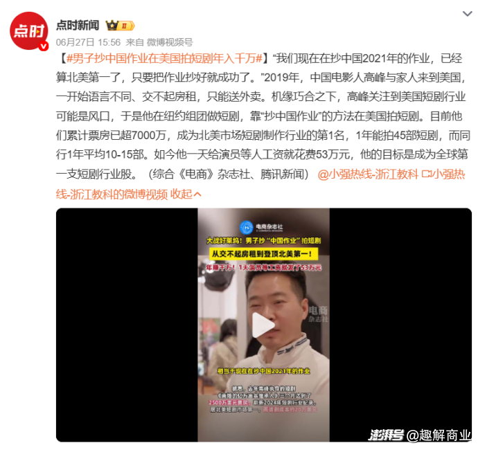 “中國男子在北美拍短劇,從交不起房租到北美行業(yè)第一”。最近,中國電影人高峰在美國拍短劇年入千萬的故事登上多平臺熱搜。