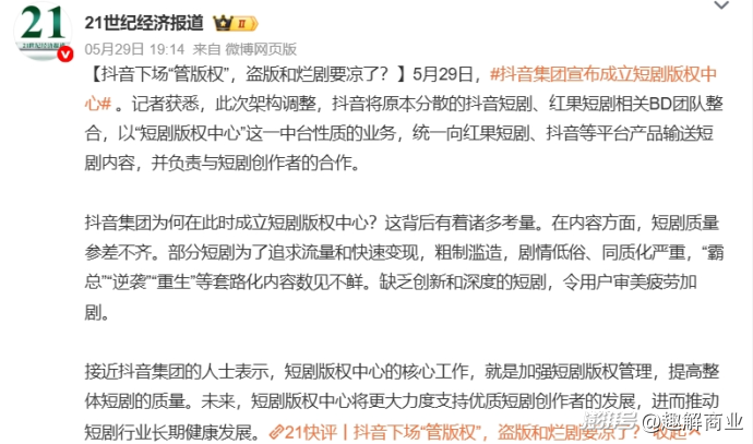 “趣解商業(yè)”注意到,今年5月份,抖音集團(tuán)成立了短劇版權(quán)中心,對原本抖音短劇、紅果短劇相關(guān)BD(即商務(wù)拓展)團(tuán)隊(duì)進(jìn)行整合,為紅果短劇、抖音等平臺產(chǎn)品統(tǒng)一提供短劇內(nèi)容。這一動(dòng)作被業(yè)界視作對短劇IP版權(quán)生態(tài)保護(hù)的新探索,也象征著抖音集團(tuán)短劇業(yè)務(wù)走向體系化建設(shè)。