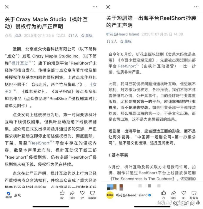 今年6月,聽花島曾指控自家短劇《家里家外》被南京燭影心光公司侵權(quán)抄襲。最近,這股“抄襲風(fēng)”已經(jīng)蔓延至海外;7月25日,聽花島和點(diǎn)眾科技在同一天發(fā)布聲明稱,“短劇第一出海平臺”ReelShort上線播放的多部海外短劇與其國內(nèi)權(quán)利作品“基本相同”、涉嫌“一比一抄襲”。