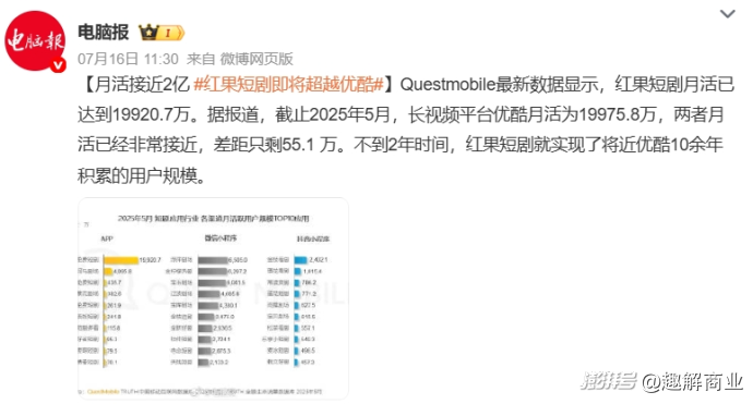 根據(jù)Questmobile的數(shù)據(jù),今年5月紅果短劇月活破1.99億,即將超過優(yōu)酷的月活,只相差50萬左右。