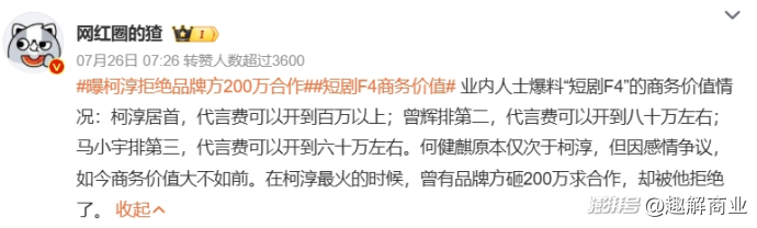 今年上半年,“短劇一哥”柯淳自曝日薪2萬的新聞,更是給短劇演員行業(yè)添了一把火。最近據(jù)“搜狐娛樂”報(bào)道,某短劇知名的演員商務(wù)代言費(fèi)報(bào)價(jià)已經(jīng)高達(dá)7位數(shù);有行業(yè)人士表示具備這一議價(jià)能力的豎屏短劇藝人就是柯淳。