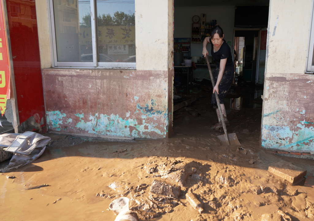 7月29日傍晚,太師屯鎮不少沿街商戶正清理淤泥,但仍停水停電,他們希望盡快重建生活。