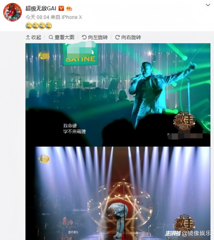 之前旋律化的唱腔被摒棄,歌詞中的“我”悉數替換為直白的“老子”,即興的節奏令字幕追趕不及。最后在歌曲結束時高喊:"歌手?我當然是歌手,我是中文說唱歌手!咱們現場見啊!"這句響亮的“現場見!”,更是毫不避諱地為個人演唱會搖旗吶喊。整個演出過程沖突感拉滿,伴奏疑似中斷,一度瀕臨失控,“GAI公務員裸辭的瘋感”占據了當天熱搜第二的位置。