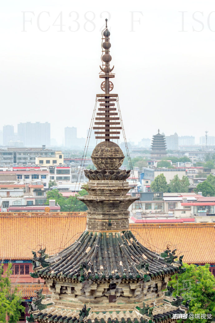 頂面以綠琉璃瓦覆蓋,脊獸和套獸也是綠琉璃制作,在陽光的照耀下,熠熠生輝,為古塔平添幾分清秀。