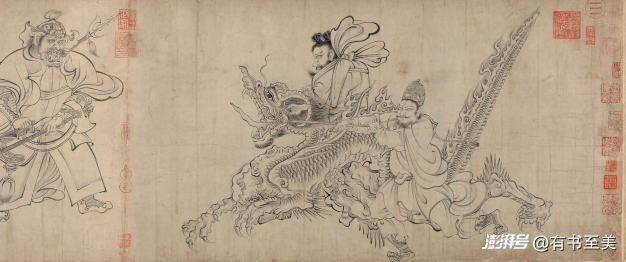 大氣磅礴:唐代吳道子的《送子天王圖》以飄逸的線條,勾勒出神怪世界的恢弘氣象。畫中天王威儀凜然,侍從鬼卒各具神態,展現出盛唐時期神怪藝術的雄渾氣度。