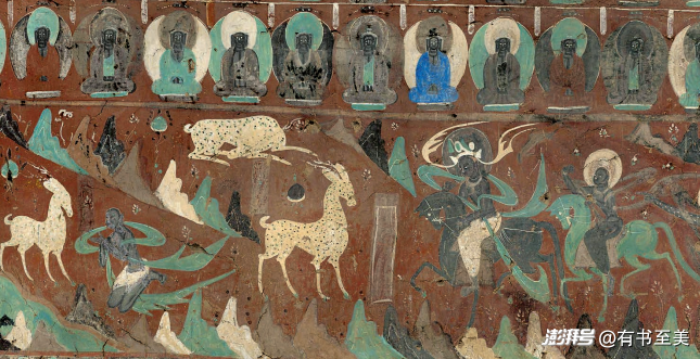 瑰麗奇幻:高窟第257窟的《九色鹿本生圖》以靈動流暢的線條勾勒出神鹿救人的傳說,畫中九色鹿通體潔白,唯鹿角綻放七彩光芒,顯得既莊嚴又夢幻。