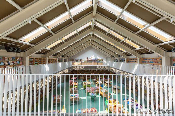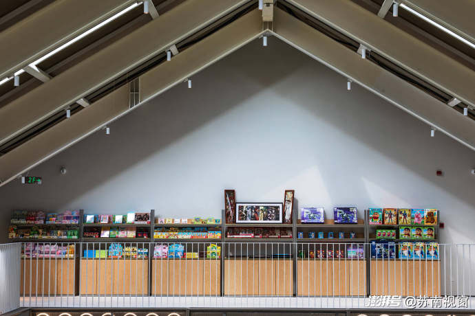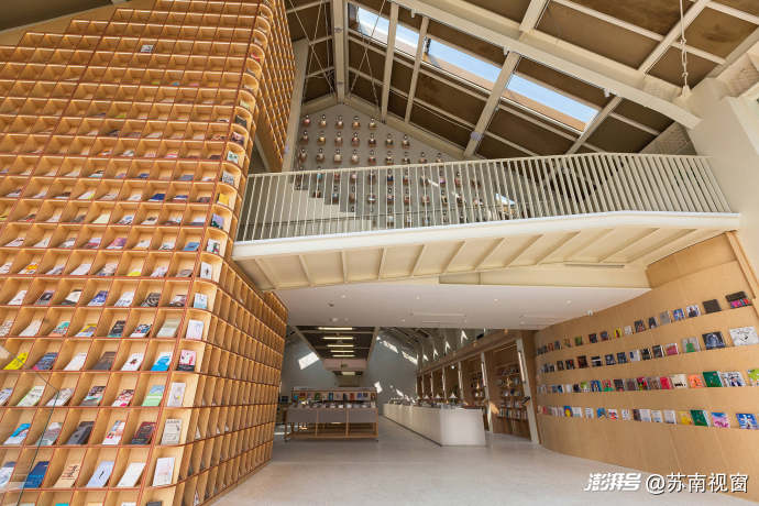 高聳的坡屋頂被完整保留,書架依著建筑的肌理而設,從地面一直延伸到屋頂,營造出一種知識的殿堂感。