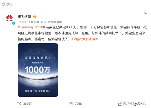 7月30日,華為宣布,鴻蒙5的終端數量突破1000萬。