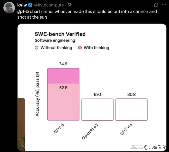 不過(guò),OpenAI的翻車變成了第一個(gè)出圈的討論。在發(fā)布會(huì)演示的現(xiàn)場(chǎng),OpenAI上來(lái)就犯了一個(gè)非常嚴(yán)重和低級(jí)的錯(cuò)誤:在現(xiàn)場(chǎng)展示的圖表中,數(shù)字大小和柱狀圖顯示的關(guān)系甚至都匹配不上,69.1和30.8的柱圖高度一模一樣,52.8甚至比69.1更大......