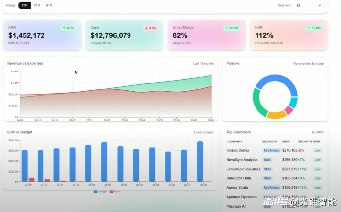 除了這種面向C端用戶體驗(yàn)的案例,在B端實(shí)際使用上,OpenAI也面向開(kāi)發(fā)者演示了GPT-5寫代碼落地的能力,GPT-5不再埋頭寫代碼,而是把“開(kāi)箱可用”的落地能力夯實(shí)了。比如,GPT-5在后臺(tái)寫代碼并自行優(yōu)化迭代之后,按照需求開(kāi)發(fā)了一個(gè)財(cái)務(wù)信息看板,UI做得也足夠漂亮。
