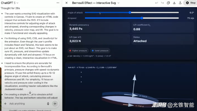 發(fā)布會(huì)現(xiàn)場(chǎng),OpenAI通過(guò)一些案例具體展示了OpenAI的編程能力,比如讓它做一個(gè)闡釋伯努利效應(yīng)的網(wǎng)頁(yè),在兩分鐘內(nèi),GPT-5跑出了400行代碼,做了一個(gè)支持調(diào)整參數(shù)的網(wǎng)頁(yè)版本。