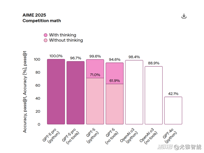 GPT-5再次向我們證明了“模型即產(chǎn)品”的觀點(diǎn)可行性——加上工具能力的GPT-5 pro,它甚至能直接把AIME 2025(美國(guó)數(shù)學(xué)競(jìng)賽)的測(cè)試刷滿分。