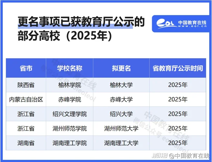 此前,8月4日,內蒙古自治區教育廳、浙江省教育廳發布高校更名公示,赤峰學院、紹興文理學院、湖州師范學院3所高校擬更名為赤峰大學、紹興大學、湖州師范大學。3月12日,湖南省教育廳發布高校更名公示,湖南理工學院擬更名為湖南理工大學。