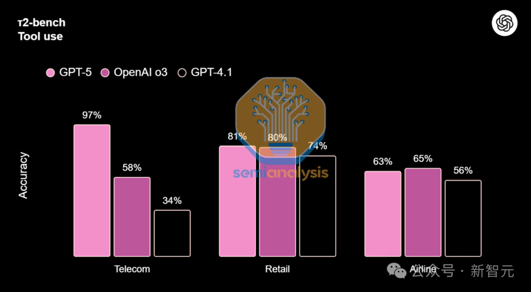 在GPT-5的發布說明中,你已經能看到未來商業化的投影:官方高調展示了Gmail、谷歌Calendar的集成,以及面向電信、零售、航空等行業的全新工具使用基準。