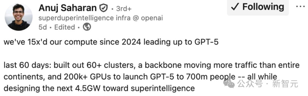 為了GPT-5,OpenAI的Anuj Saharan透露算力增加了15倍,動用超過20萬塊GPU,服務7億用戶。