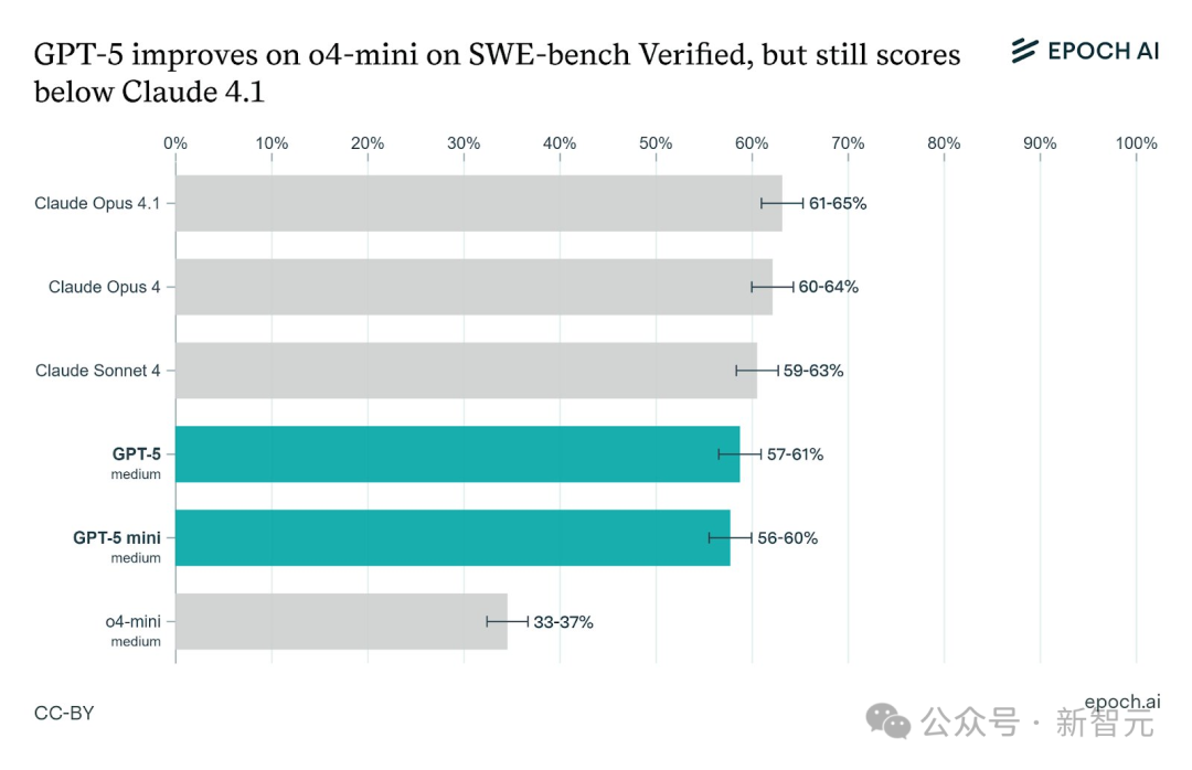 在編程測試SWE-bench Verified上,GPT-5進步明顯,稍低于Claude 4系列;