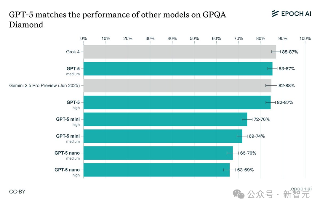 此外,在多個基準測試上,Epoch AI獨立評估了GPT-5,表現非常亮眼: