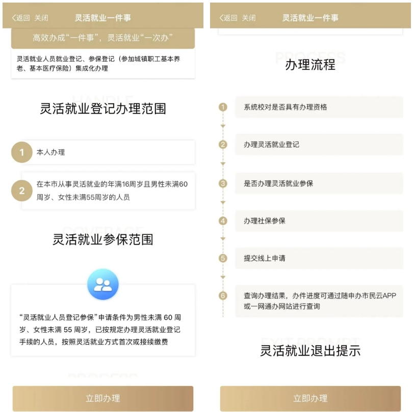 可登錄“隨申辦市民云”APP,搜索“靈活就業一件事”進入辦理功能,點擊“立即辦理”進行申報。