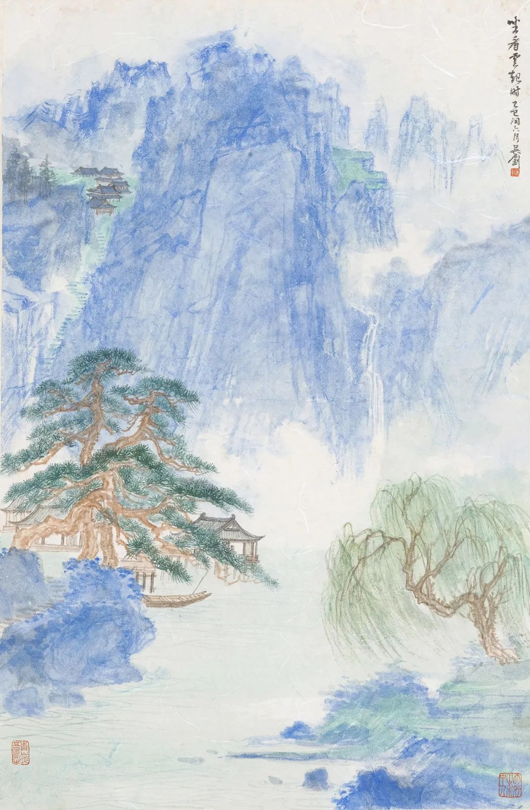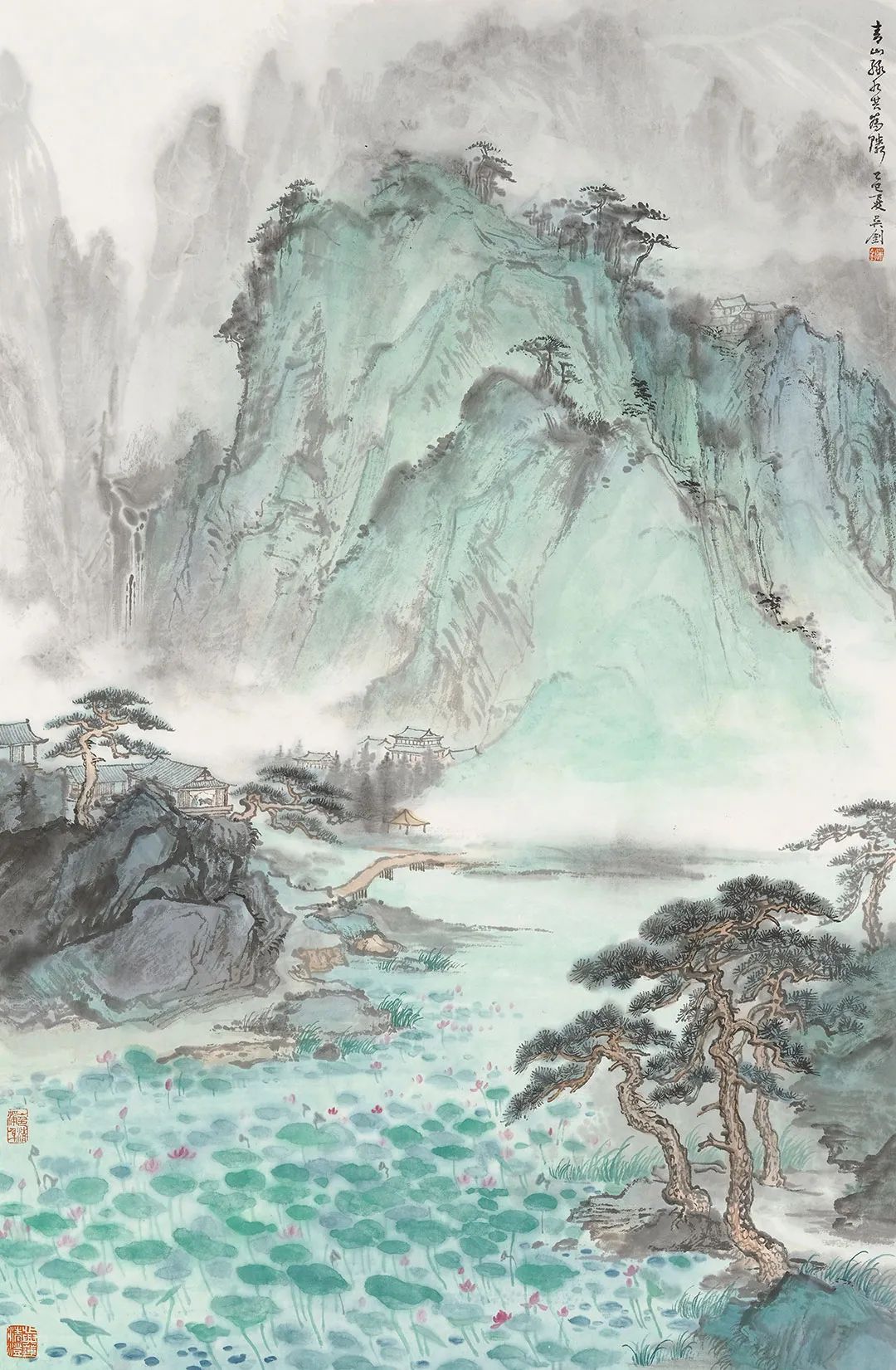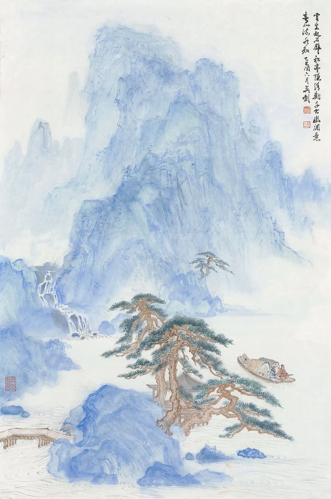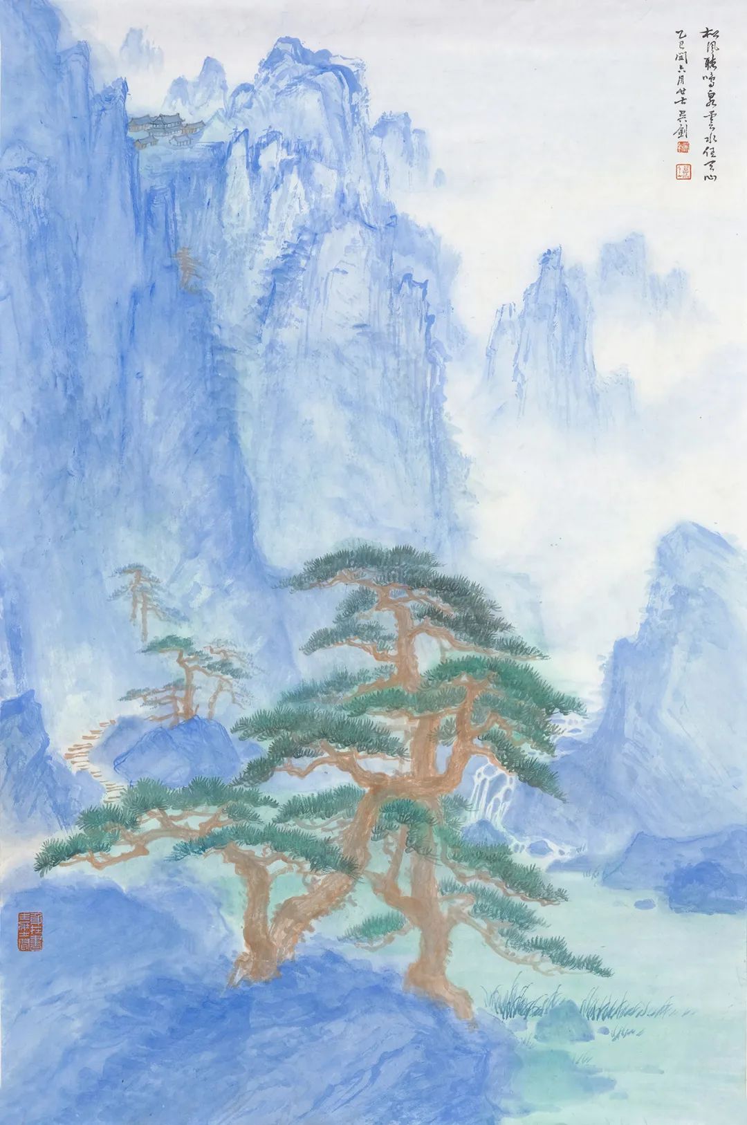 山色溢彩,時青時綠,似秀潤江南晨霧初霽,氤氳得極其溫和。松姿隨性,斜逸橫出,偃仰坐臥如親友對語,松弛自在舒展安逸。情不自禁聯想起倪瓚所言“畫者,寫胸中之逸氣也” ,畫家將內心的閑逸,借著挺秀青松自在丘壑泉石間,悠然于紙上。