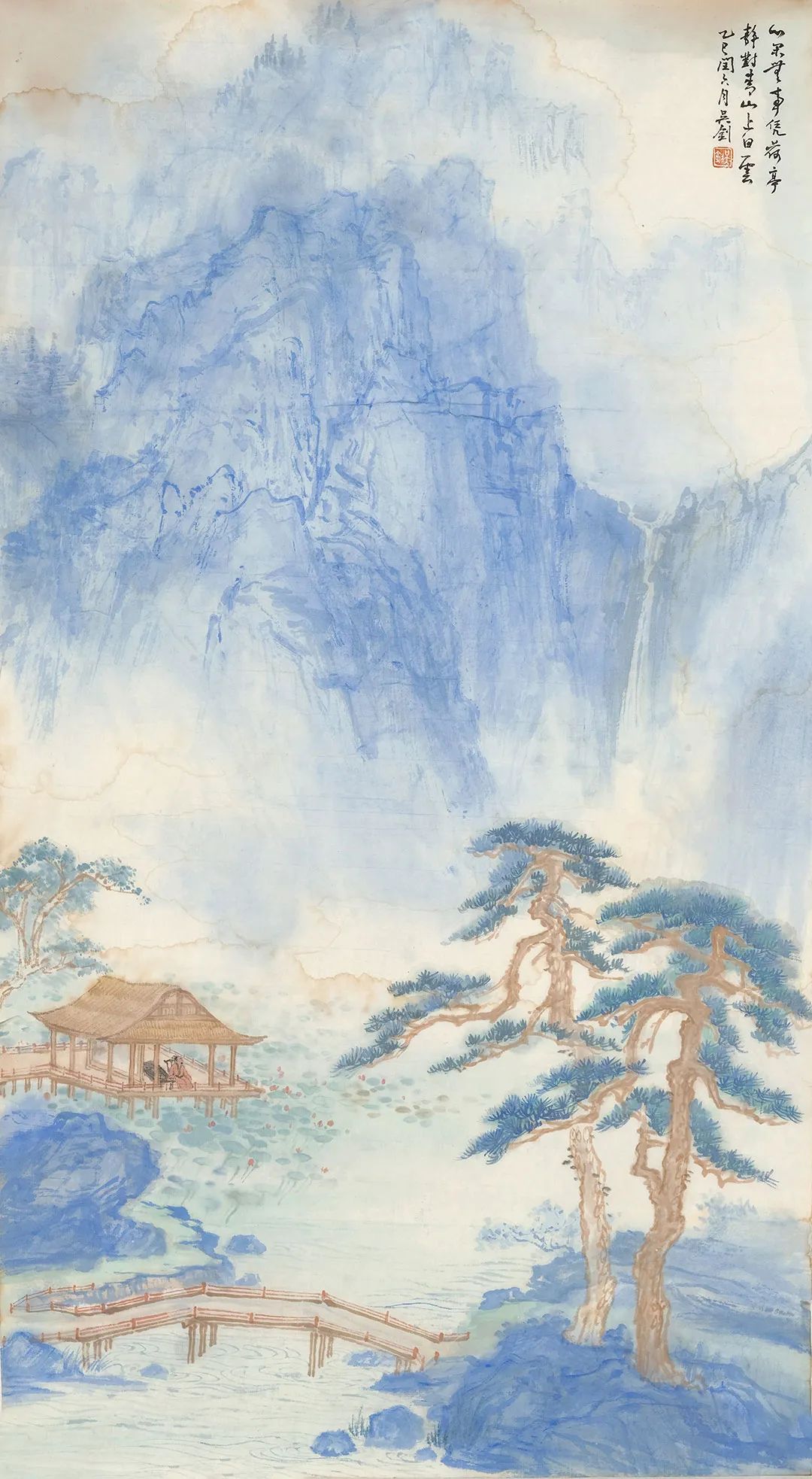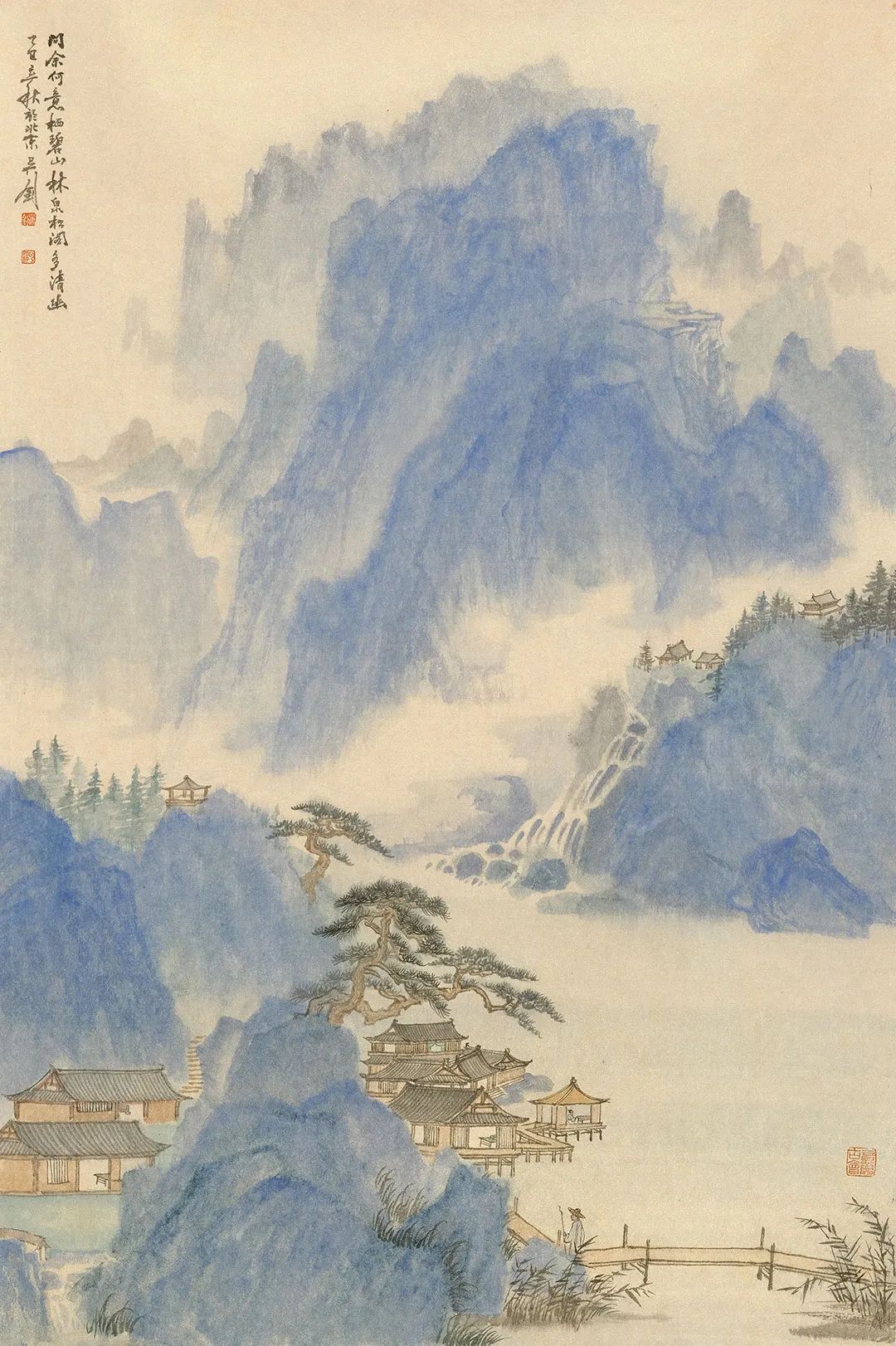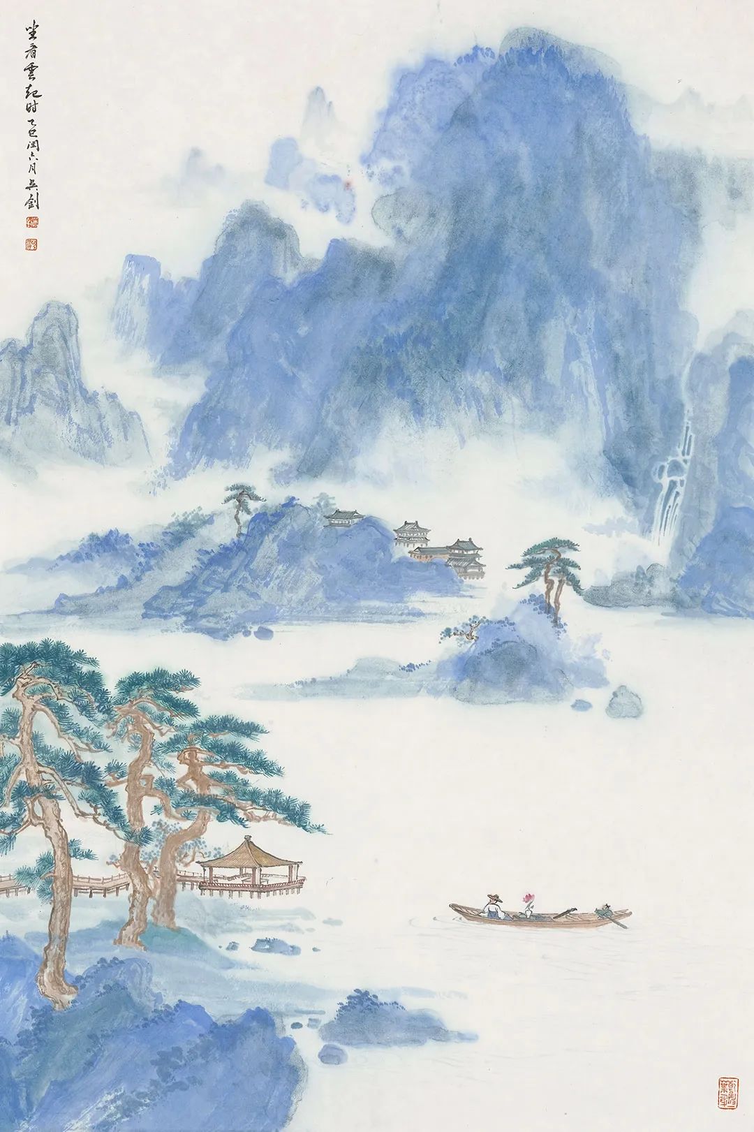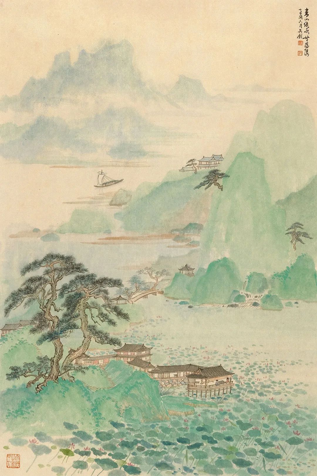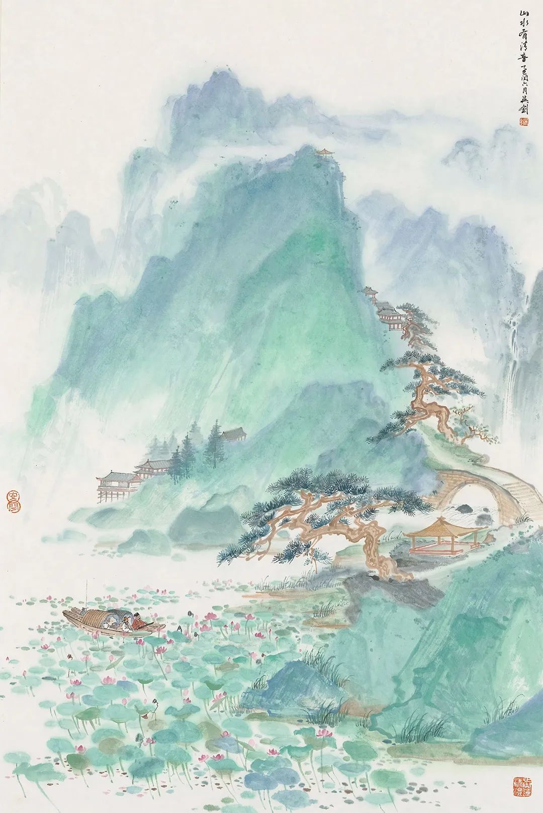 山色溢彩,時青時綠,似秀潤江南晨霧初霽,氤氳得極其溫和。松姿隨性,斜逸橫出,偃仰坐臥如親友對語,松弛自在舒展安逸。情不自禁聯想起倪瓚所言“畫者,寫胸中之逸氣也” ,畫家將內心的閑逸,借著挺秀青松自在丘壑泉石間,悠然于紙上。