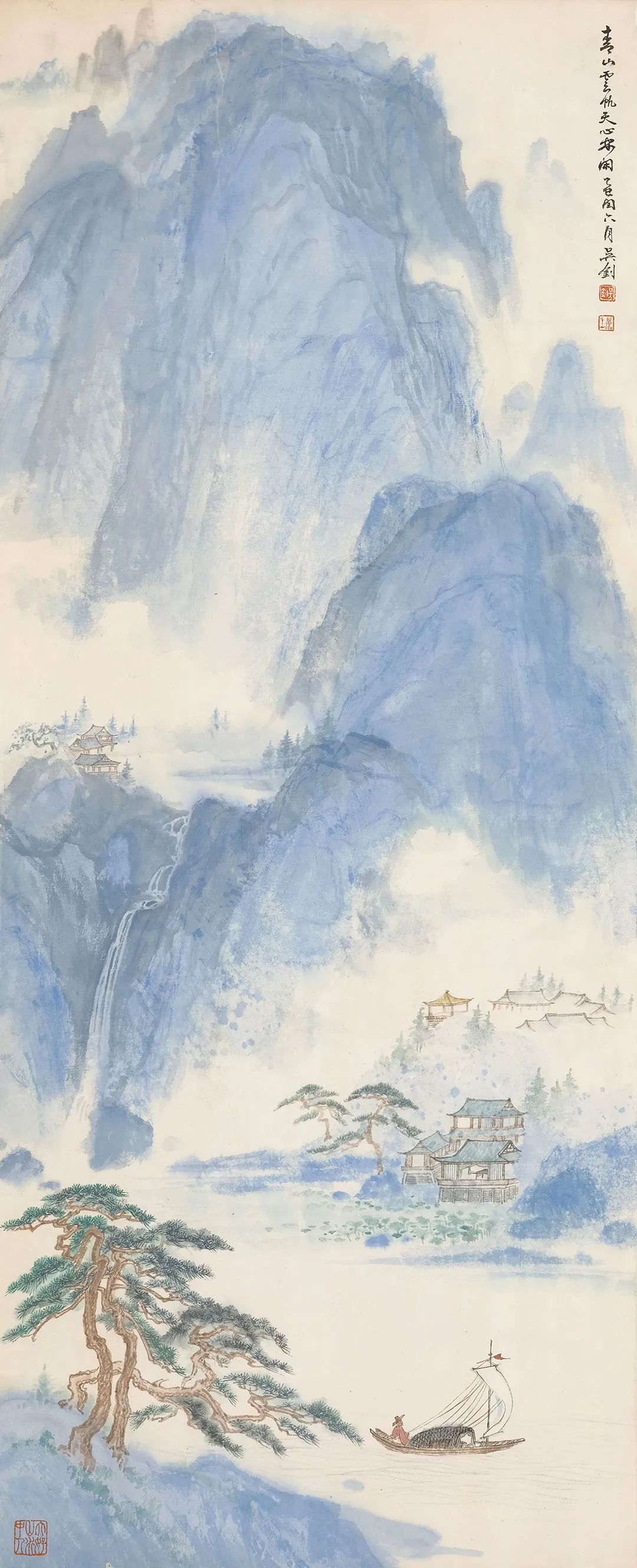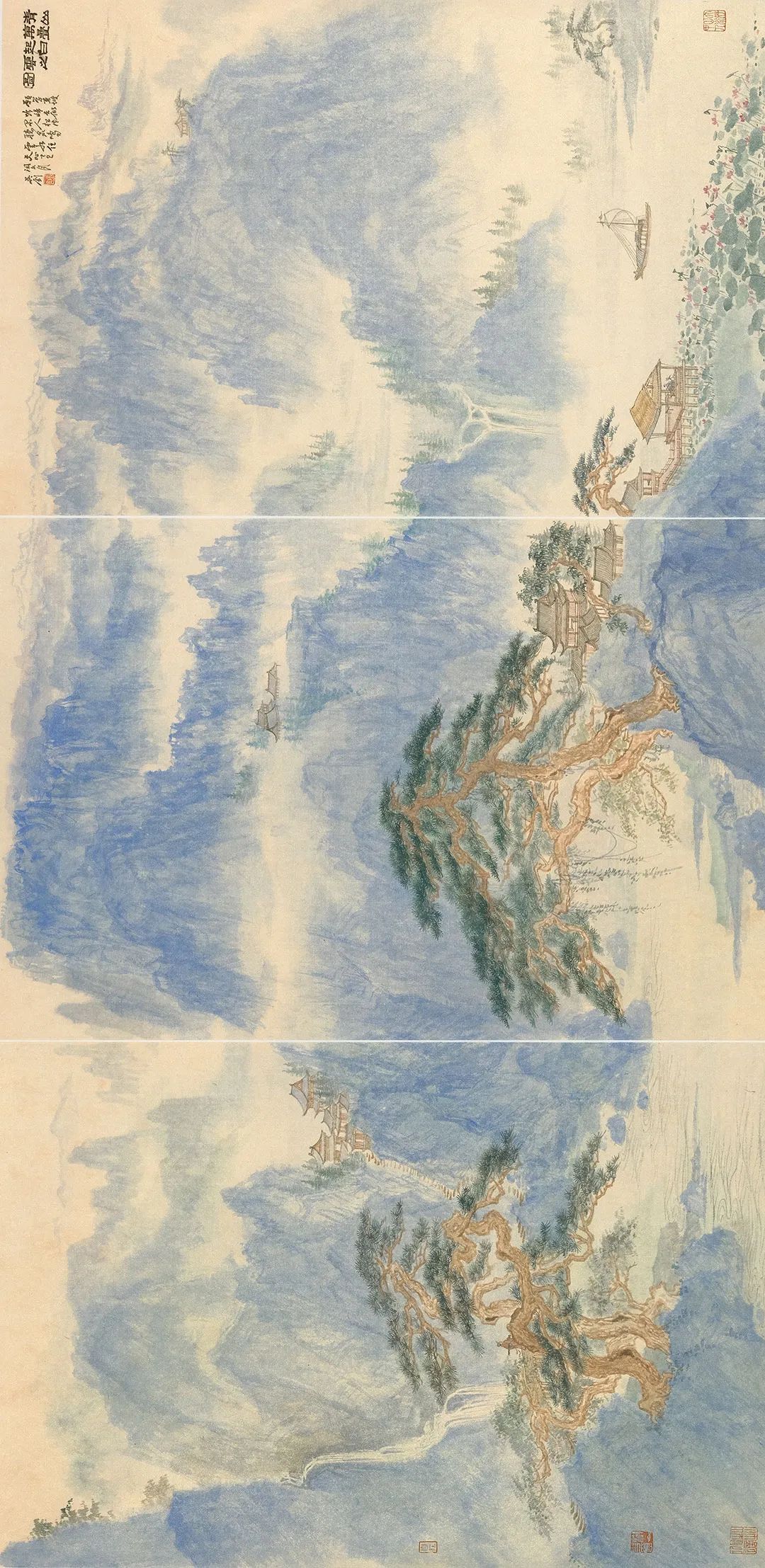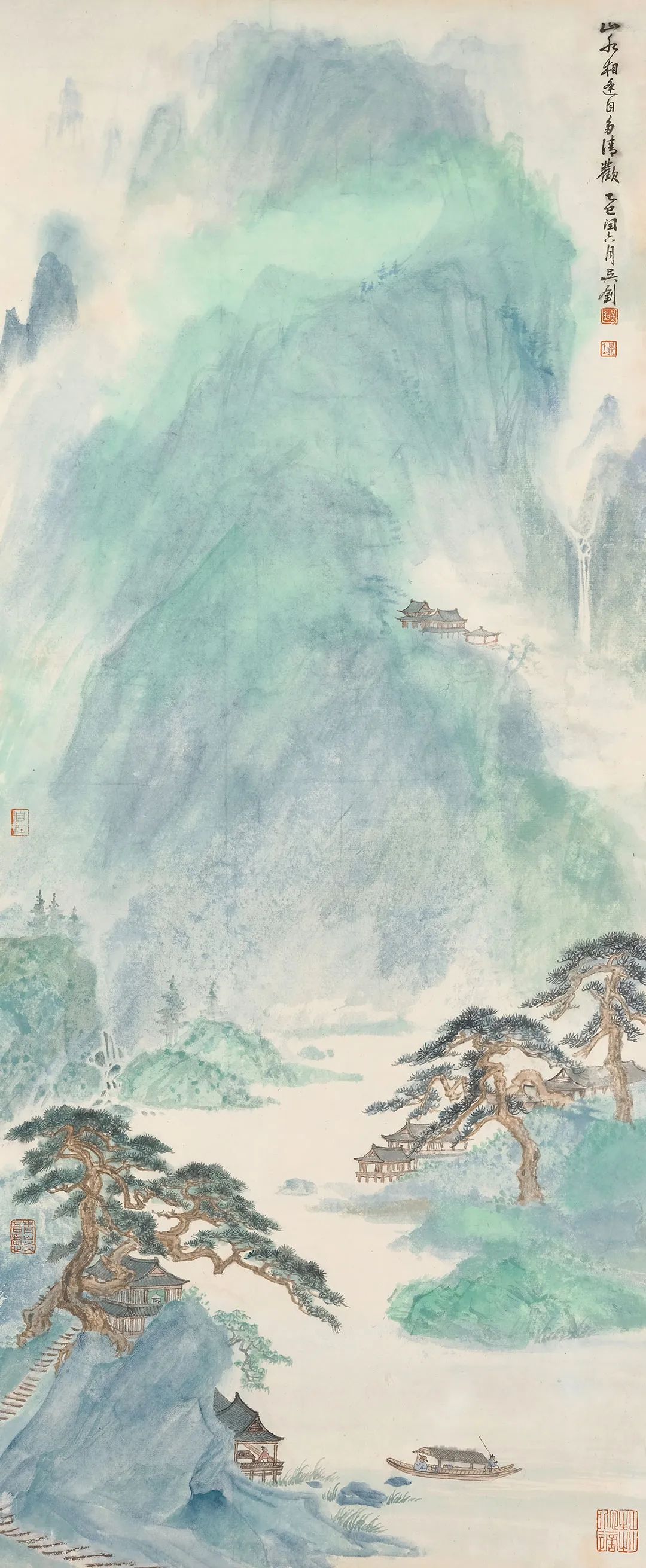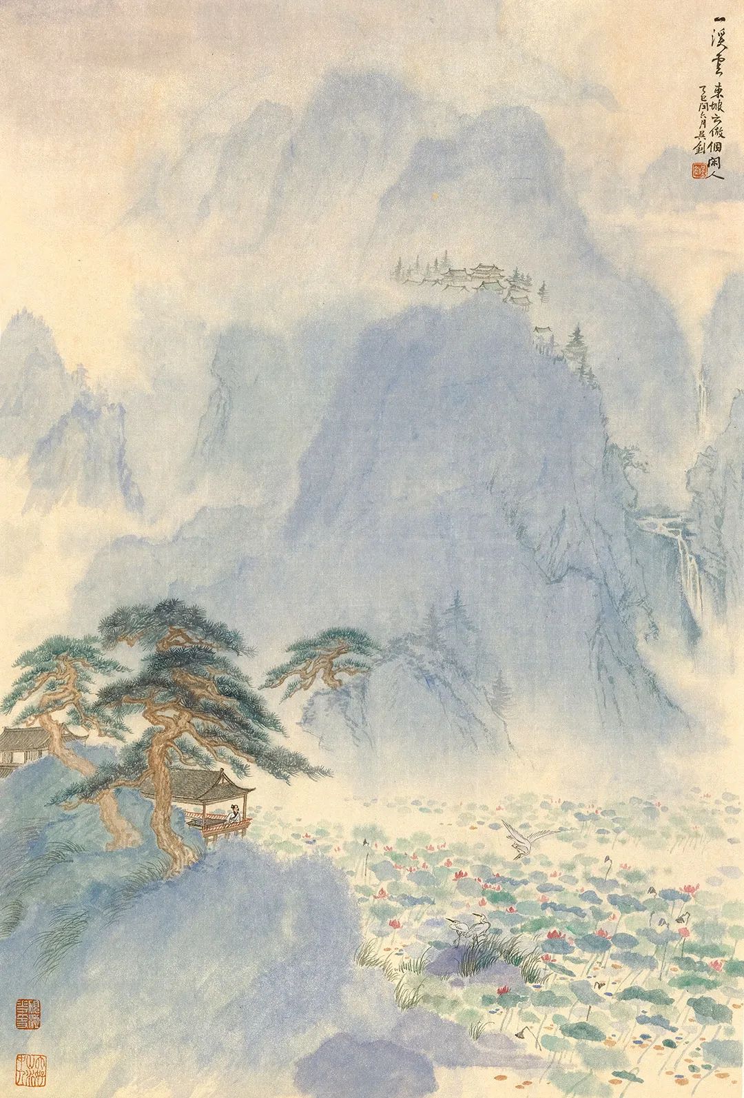 山色溢彩,時青時綠,似秀潤江南晨霧初霽,氤氳得極其溫和。松姿隨性,斜逸橫出,偃仰坐臥如親友對語,松弛自在舒展安逸。情不自禁聯想起倪瓚所言“畫者,寫胸中之逸氣也” ,畫家將內心的閑逸,借著挺秀青松自在丘壑泉石間,悠然于紙上。