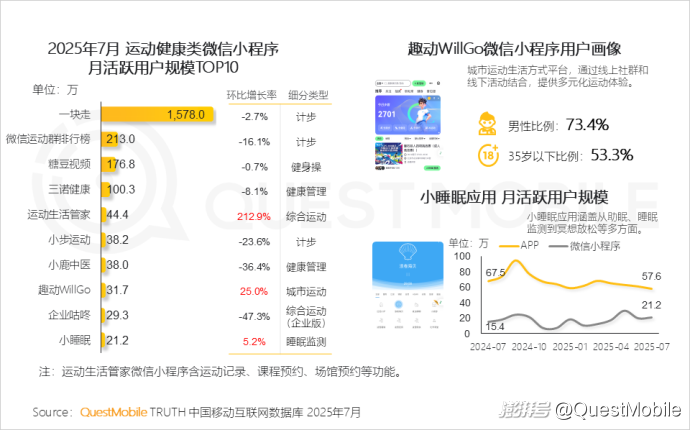 QuestMobile數據顯示,7月趣動WillGo微信小程序用戶規模達31.7萬,環比增幅25%,其中男性占比超七成,35歲以下占比達到53.3%。小睡眠微信小程序用戶規模環比增幅5.2%,達21.2萬。