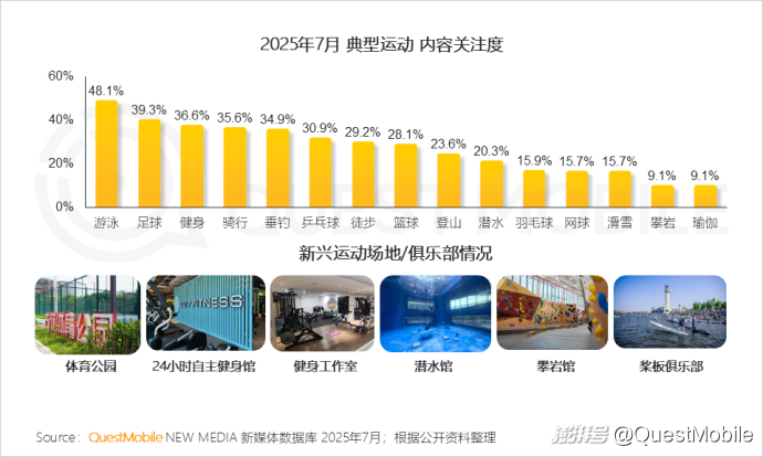 2、運動市場呈現雙軌并行動態格局,游泳、足球、健身等大眾項目構筑市場根基,潛水、攀巖等新興業態進一步推進市場結構躍遷與此同時,全民健身需求升級驅動場地、服務的革新,體育公園構建家門口的運動休閑綜合體;健身場館正通過24小時開放、定制化服務等形式,契合用戶差異化需求;潛水館、攀巖館、槳板俱樂部等垂直業態的崛起,推動市場向個性化、細分化加速躍遷。