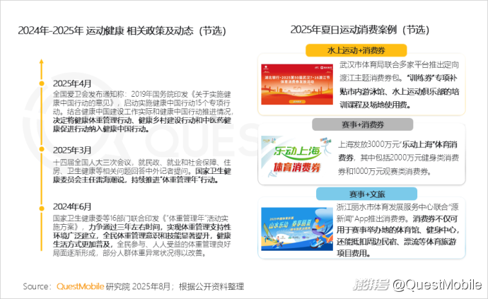 1、全民體重管理政策與健康消費升級深度聯動,推動運動健身經濟從短期熱點邁向覆蓋全人群、全周期的可持續增長新模式全國多地陸續發放體育消費券,通過因地制宜的差異性政策設計,滿足用戶多元的消費需求,為夏日的運動消費注入鮮活動力。