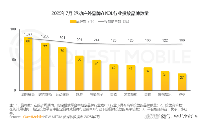 4、劇情、時尚穿搭、運動健身類KOL成為運動戶外品牌合作主要賽道,投放商單數集中度較高,同時,旅游、母嬰親子類KOL也因其受眾需求高,受到品牌青睞