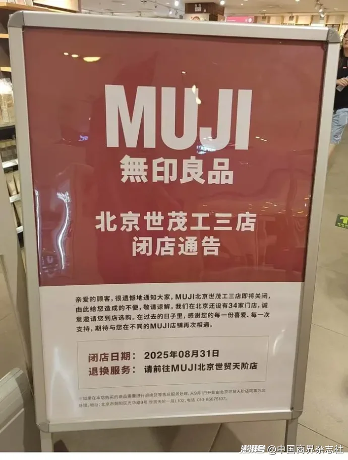 有網友在社交媒體稱,MUJI無印良品在北京的世茂工三店將終止營業。網友曬出門店張貼的“閉店通知”顯示,該門店閉店時間為2025年8月31日,消費者若有退換貨服務可往MUJI北京世貿天階店,“很遺憾地通知大家,MUJI世茂工三店即將關閉,由此給您造成的不便,敬請諒解。我們在這個城市還設有34家門店,誠意邀請您到店選購。”