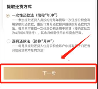 第五步:根據自身實際情況選擇提取還款方式,選中“一次性還款法”或“逐月還款法”按鈕后,選擇“下一步”。