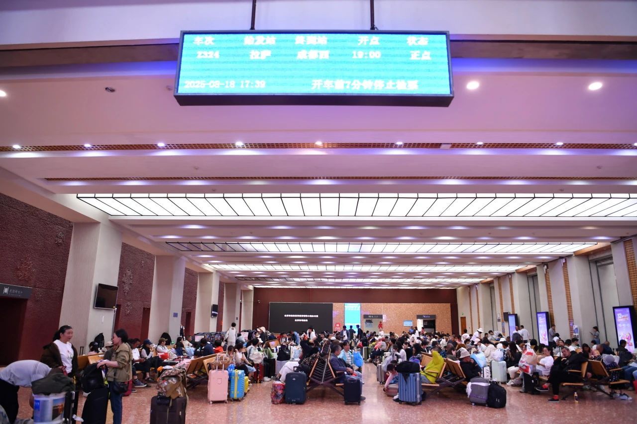 一層候車室里,幾乎座無虛席。“10年前就想來拉薩,今年終于圓夢了!”來自成都的62歲旅客余女士興奮不已,“我們乘坐Y971次旅游列車進藏,一路上欣賞草原、雪山、湖泊,晚上還在火車上看到了星星呢!”