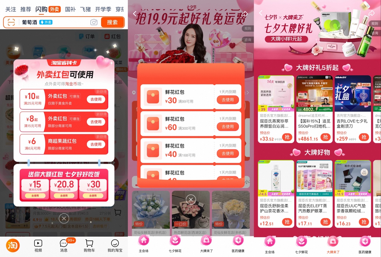 消費者打開淘寶App,進入閃購頻道,就能領取大額七夕鮮花禮品紅包。除鮮花外,還可以下單輕奢包包、美妝護膚、黃金飾品、3C數碼、潮流玩具等禮品送給愛人。儀式感消費也成為七夕送禮一大趨勢。葡萄酒、香氛香薰、情侶家居服等淘寶閃購訂單增幅顯著。