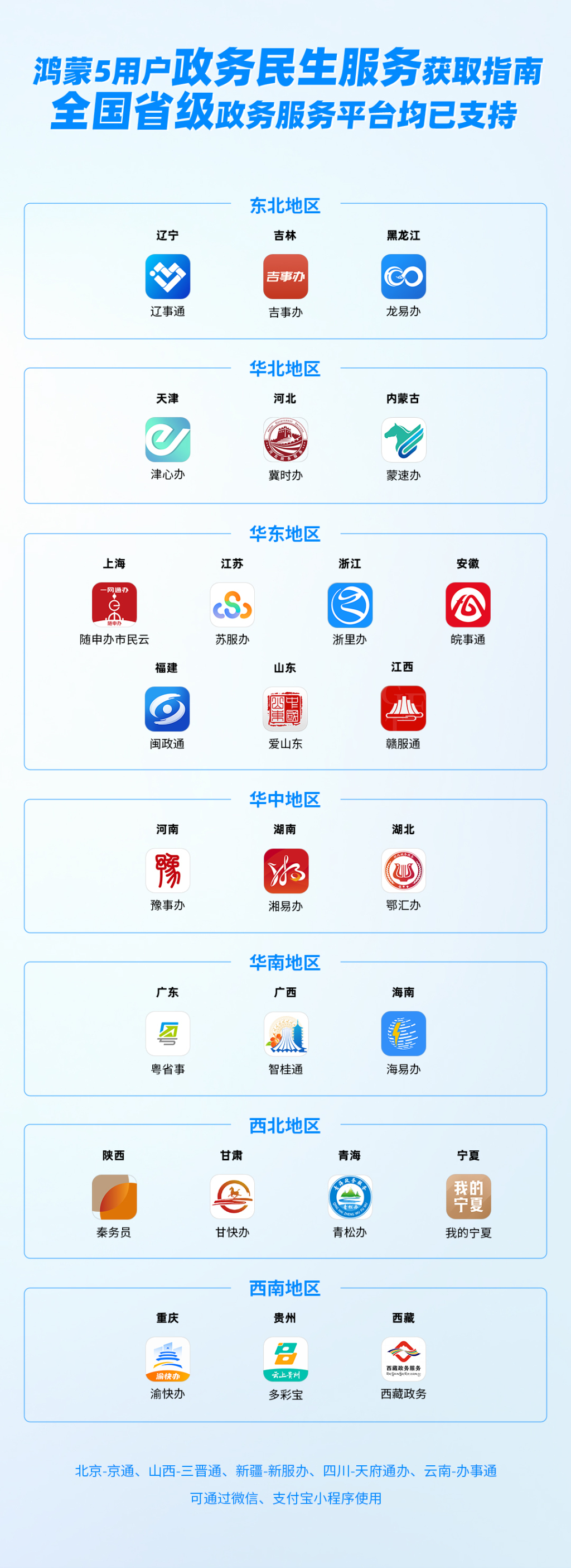 華北地區(qū)多數(shù)平臺已完成適配,如天津“津心辦”、河北“冀時辦”、內(nèi)蒙古“蒙速辦”均已上架。北京市則以小程序?yàn)橹饕?wù)載體,持續(xù)推進(jìn)數(shù)字化政務(wù)服務(wù)。西南地區(qū)多數(shù)省份如重慶“渝快辦”、貴州“多彩寶”、西藏“西藏政務(wù)”也已上架運(yùn)行。
