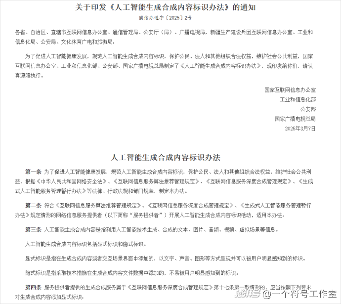 今年3月,國信辦等官方機構印發了《人工智能生成合成內容標識辦法》。