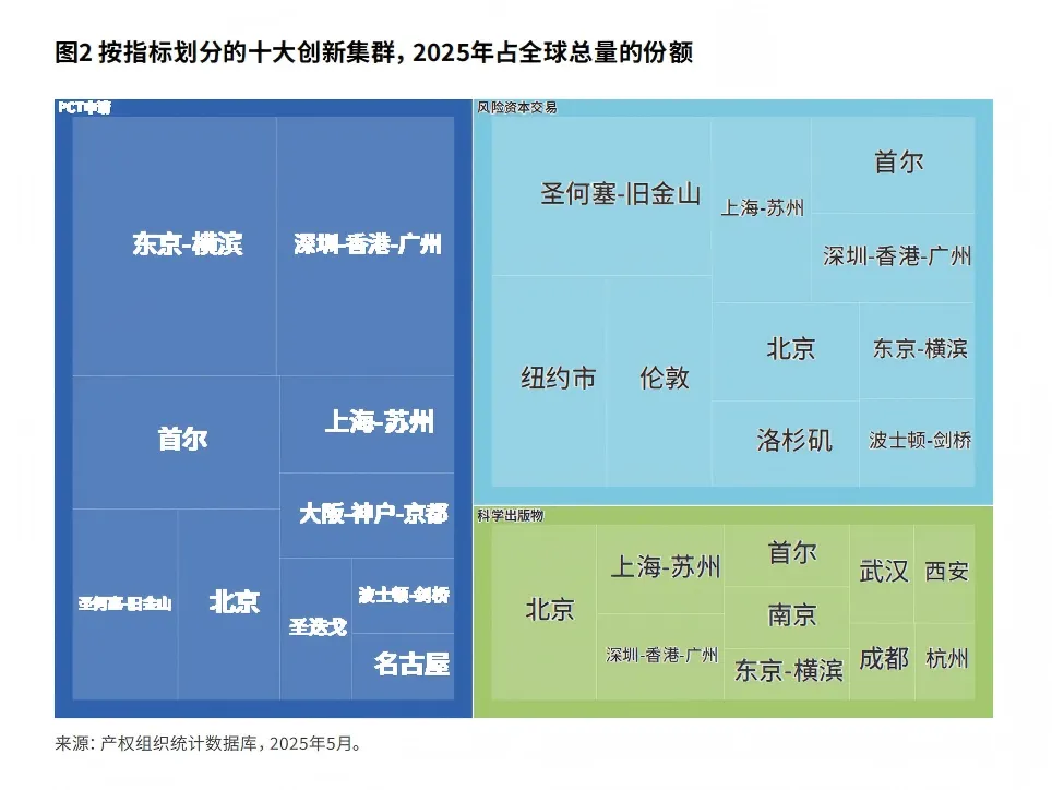 2025年,全球創新指數(GII)集群通過三項核心指標識別世界級創新活動在當地的集中程度。這三項指標是通過產權組織《專利合作條約》(PCT)提交的國際專利申請量、科學論文發表量,以及今年新增的風險資本交易量。