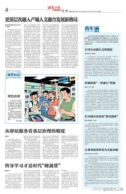 中文系本科生朱悅婷撰寫的觀點短文刊登在《諸暨日報》