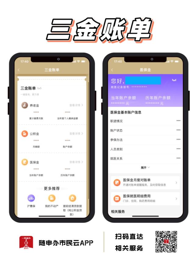 “隨申辦市民云”APP【三金賬單】專區,可在線查看醫保金、養老金、公積金。