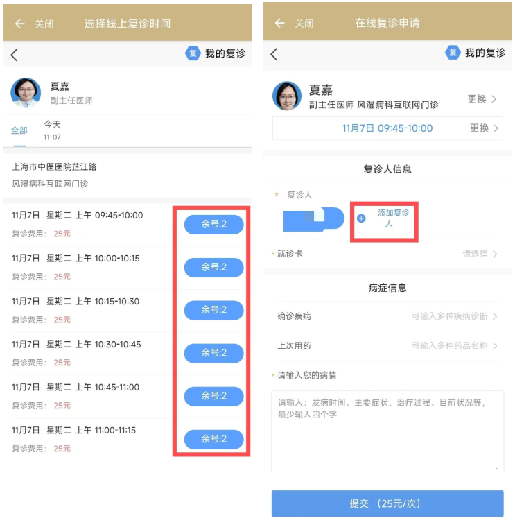 第四步:可點擊右方藍色按鈕,預約對應(yīng)的時間段,進入預約頁面后請點擊“添加復診人”并按照提示填入信息。