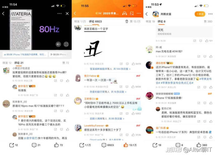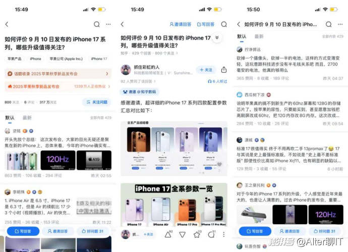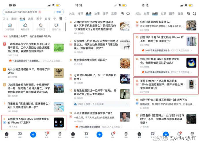 知乎熱榜的話題集中在iPhone 17上,除了120Hz刷新率這樣的技術細節討論,其他的話題以發布會本身為主。和知乎問題驅動和答案沉淀的機制有關,容易形成“慢熱長尾”的知識復利,但量級適中、峰值不高。