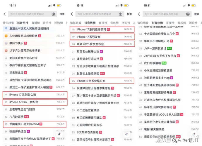 抖音熱榜上同樣有7個蘋果發布會相關的話題在榜,集中在價格、配色等預期話題上,衍生的討論比較有限。抖音熱榜是“信息的最大公約數”,但公共討論和破圈能力受到了算法的限制。