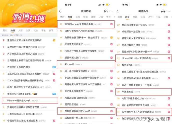 先來看微博熱搜,一共有7個蘋果發布會相關的話題還在熱搜榜上,其中“蘋果發布會”已經掉到了38位,取而代之的是一系列由發布會衍生出的新話題,涵蓋價格、明星效應、周邊產品以及社會爭議等不同維度。從“單一主話題”到“多元子話題”的演變,標致著信息的發酵與裂變。